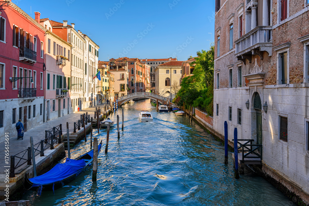Narrow canal with gondola and boats in Venice, Italy. Architecture and landmark of Venice. Cozy cityscape of Venice. #1765615691