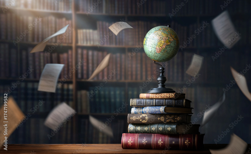 Old geographical globe and old book in cabinet with bookselfs. Science, education, travel background. History and geography team. Ancience, antique globe on the background of books. #1747199582