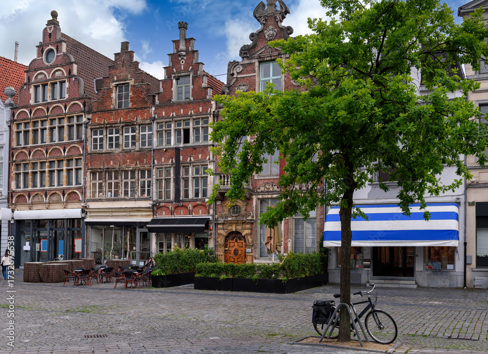 Old narrow street with tables of cafe in Ghent (Gent), Belgium. Architecture and landmark of Ghent. Cozy cityscape of Ghent. #1732675538