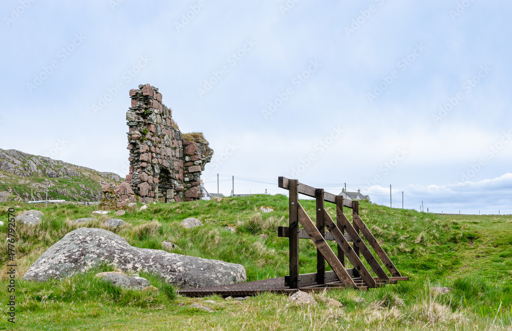 Old stone ruin and wooden bridge in a grassy field on Iona near the Isle of Mull, Scotland. Historic landmark surrounded by wild nature. #1776792570