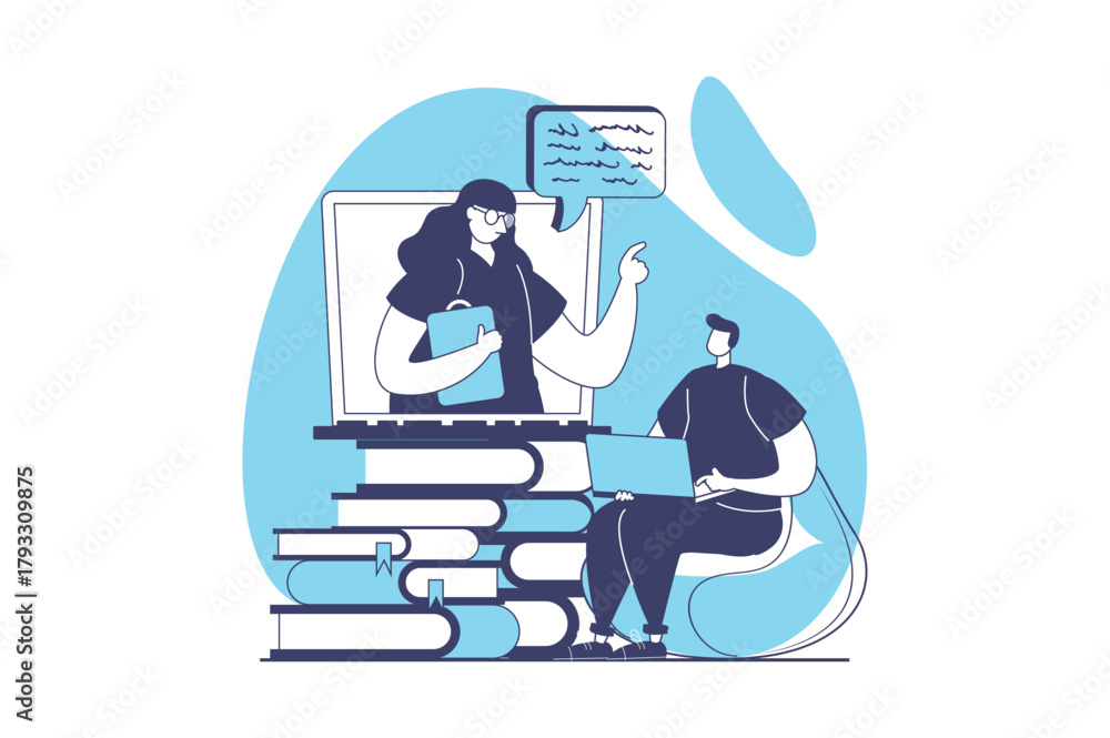 Online education web concept with flat people for website design. Man student learning at video lessons, watching seminars with teacher, trainings at webinars and e-learning. Vector illustration. #1793309875