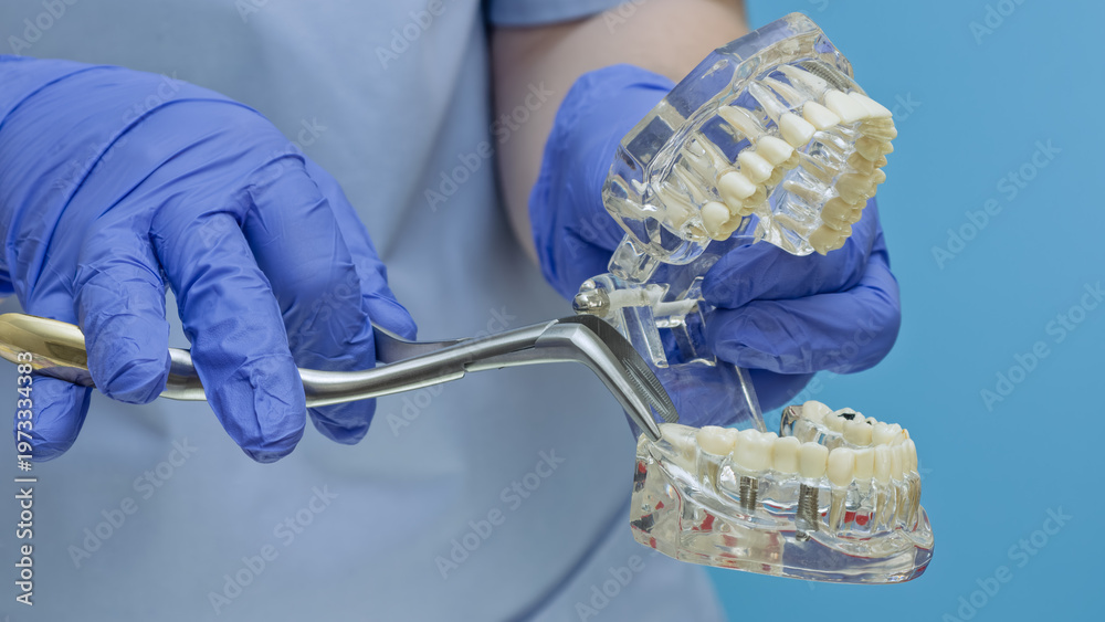 Oral surgery concept. Doctor hands holding dental extraction forceps and transparent teeth typodont. #1973334383