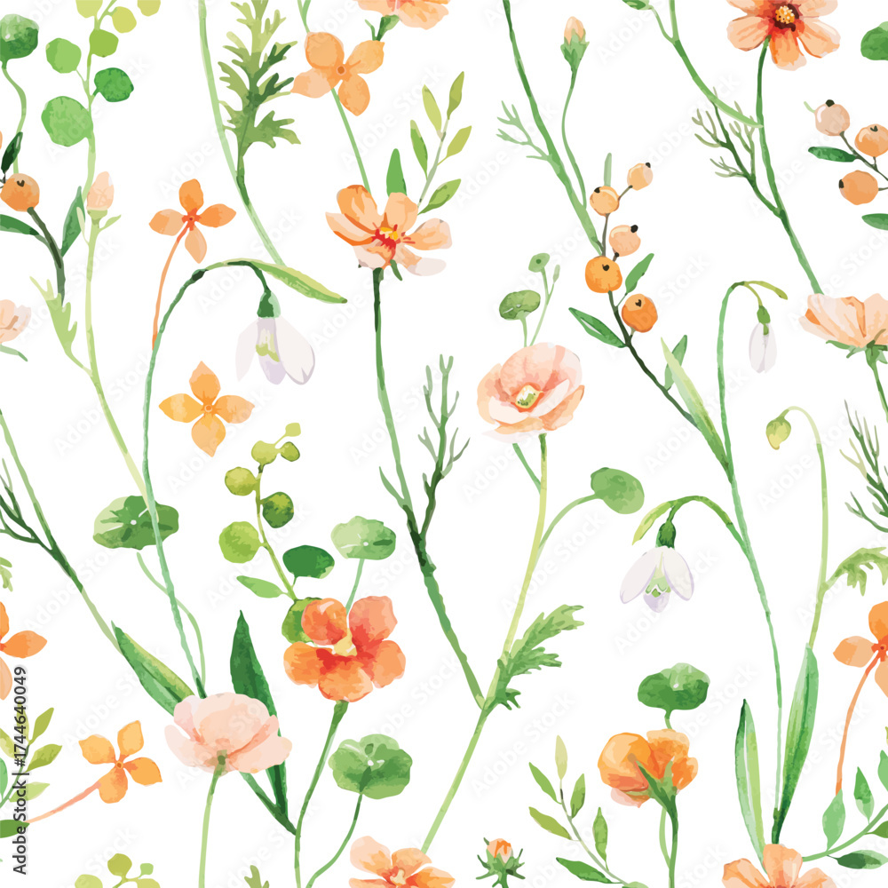 Orange Flower Seamless Pattern. floral background featuring a variety of wildflowers in a watercolor style. Bright and vibrant colors, perfect for fabric patterns, backgrounds, and gift wrap designs. #1744640049
