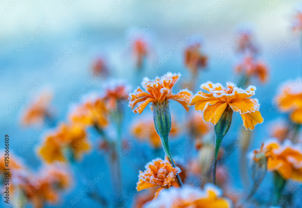 orange marigold flowers covered with cold clear crystals of blue frost on a frosty morning in the autumn garden #1753666109