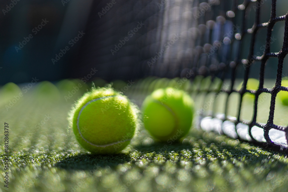 Padel balls on court during sunny day, clean and minimalistic image for sports websites, blogs, and promotional materials. #1812863737