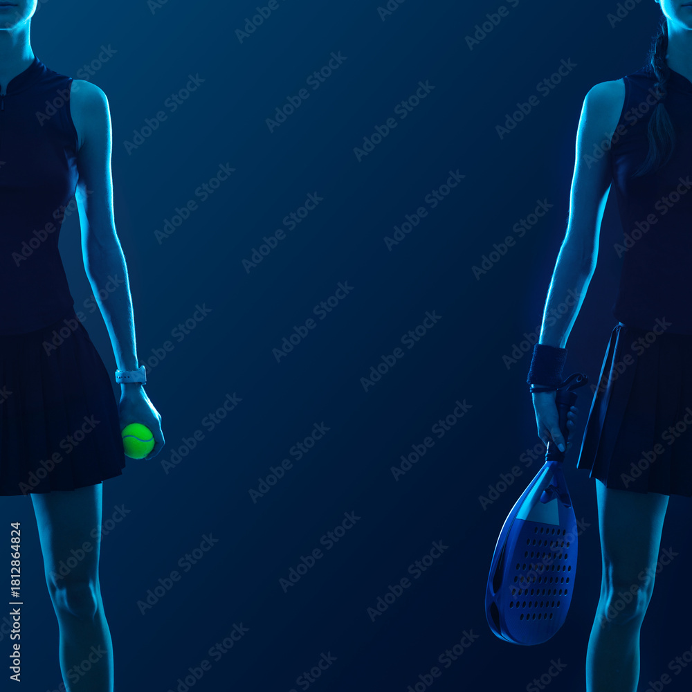 Padel tennis player with racket on tournament. Girl athlete with paddle racket on court with neon colors. Sport concept. Horizontal banner with copy space. Social media banner. #1812864824