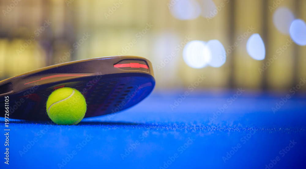 Padel tennis racket with ball. Background with copy space. Sport court and ball. Download a high quality photo with paddle for the design of a sports app or social media advertisement #1972661105