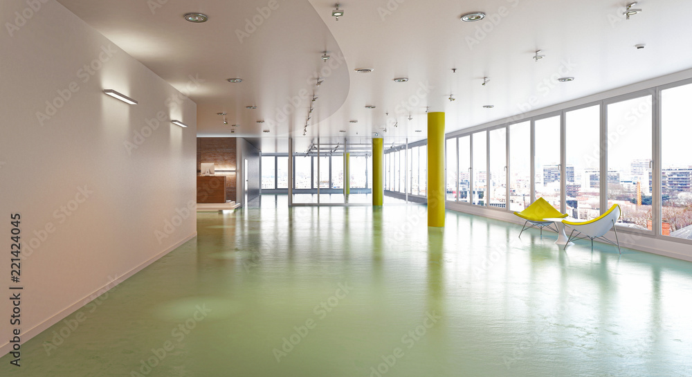Panoramica di un centro commerciale vuoto, rendering 3d, illustrazione 3d #221424045