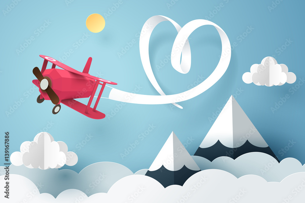 Paper art of ribbon hang with a pink plane flying in the sky, origami and valentines day concept #139167886