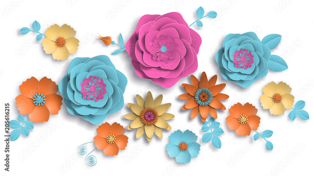 Paper art, summer flowers on a white background with leaves cut of paper. Vector stock illustration #205616215