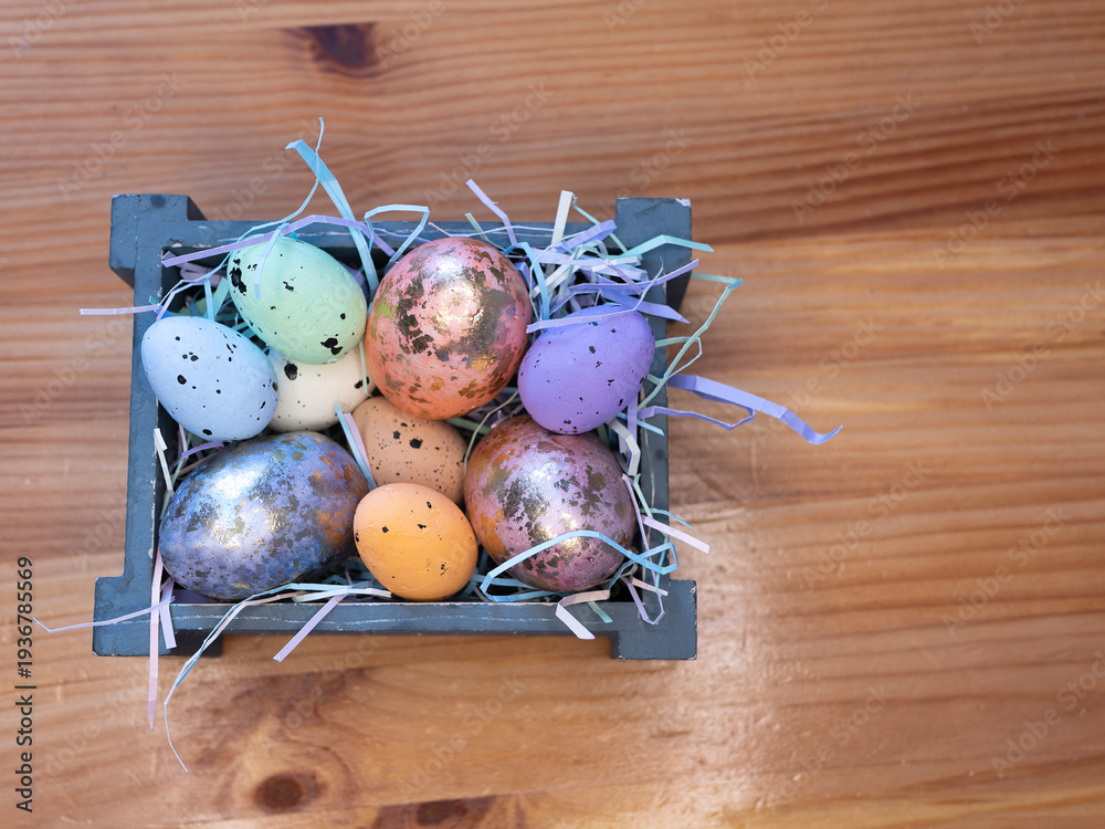 Pastel and metallic Easter eggs in a wooden basket decorated with decorative straw on a wooden table. A festive spring backdrop for greeting cards and banners #1936785569