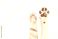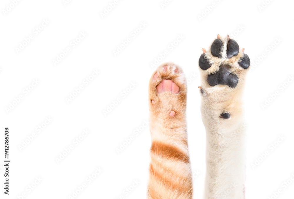 Paws of a fawn Labrador dog and a red Scottish Straight cat isolated on white background #1912786709
