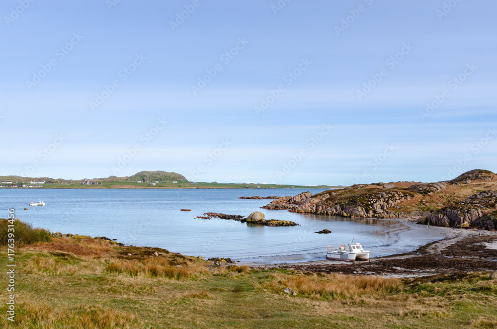 Peaceful coastal bay with clear blue water, gentle waves, and rocky shoreline surrounded by grassy hills on the Isle of Mull, Scotland. #1763931456