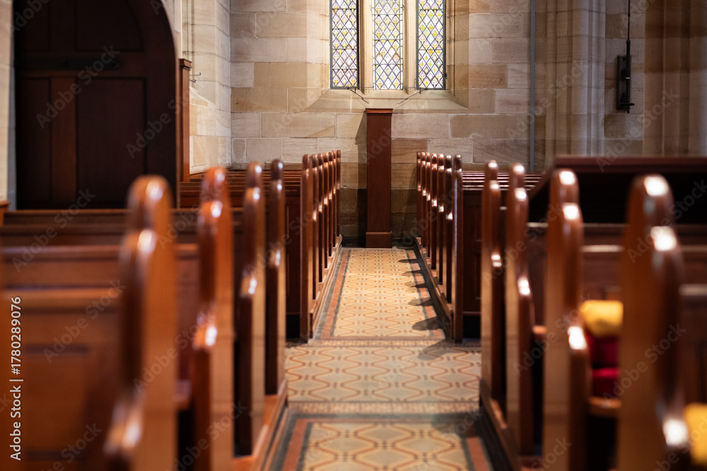 Peaceful Interior of a Historic Church Aisle #1780289076