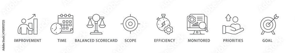 Performance management banner web icon vector illustration concept with icon of improvement, time, balanced scorecard, scope, efficiency, monitored, priorities and goal #700951725