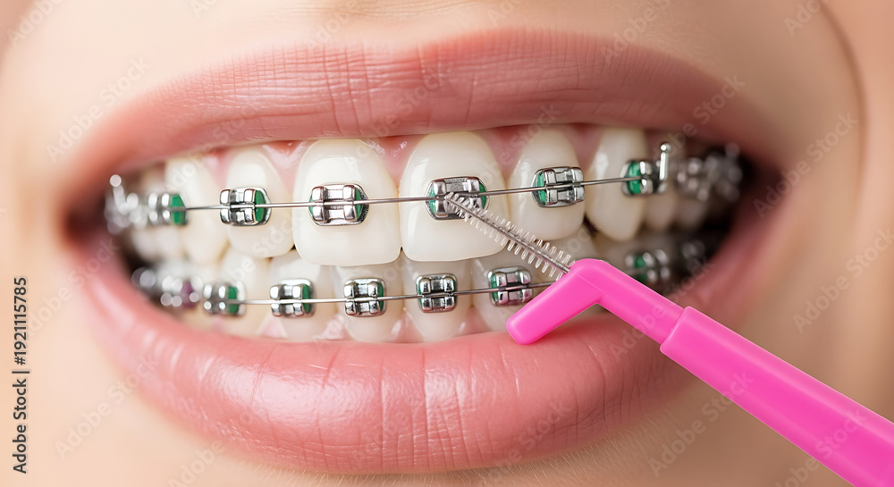 Person cleaning braces with pink interdental brush teeth hygiene #1921115785