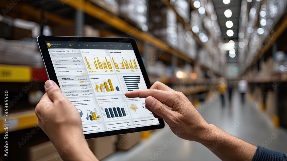 Person interacts with a tablet displaying inventory details while surrounded by shelves full of boxes in a warehouse setting #1745365500
