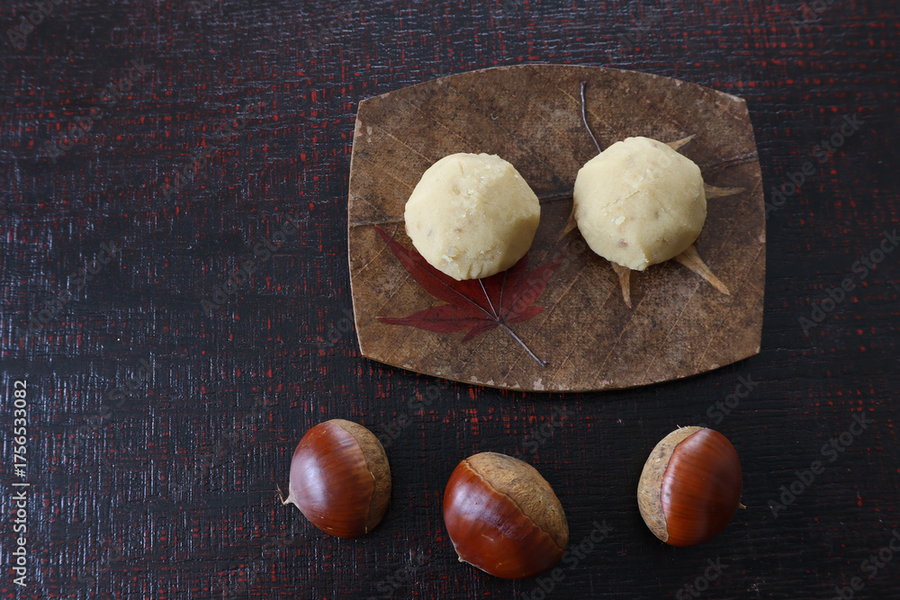 漆塗り板に置かれた皿にのせた栗きんとん #1756533082