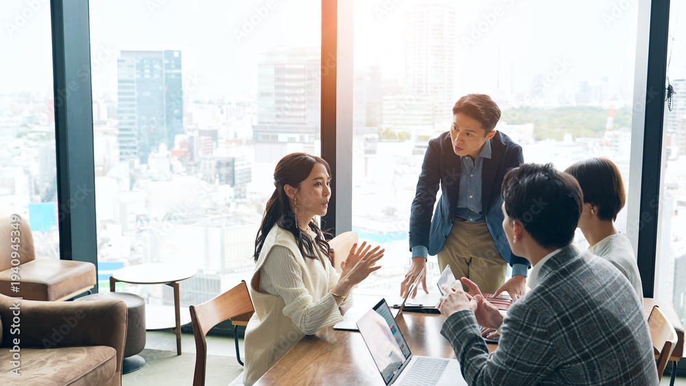 オフィスで会議するカジュアルなビジネスパーソンのグループ #1940945349