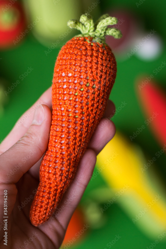 photo knitted carrot in hand on a green background #343196260