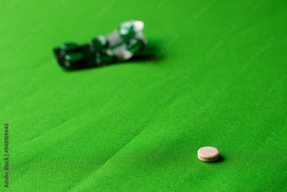 photo open green pack of pills lies on a green background next to the tablet #343189645