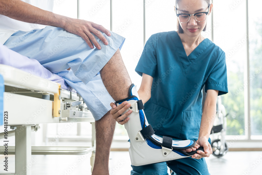 Physical therapy. Female Nurse aids young man in recovering from spine injury and providing orthopedic massage Orthopedic healthcare and chiropractor with person for physical therapy rehabilitation #1694187223