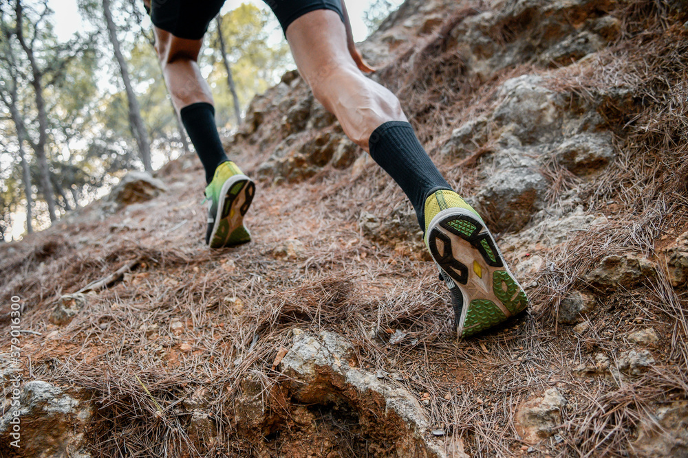 Piernas de un corredor subiendo por una cuesta en la montaña #379016300