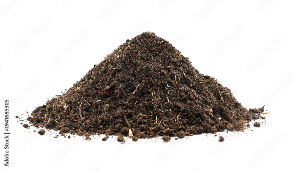 Pile of organic soil isolated on white background, natural compost texture for gardening, agriculture, planting, and eco-friendly farming concepts. Ideal for sustainability and environmental design. #1941685305