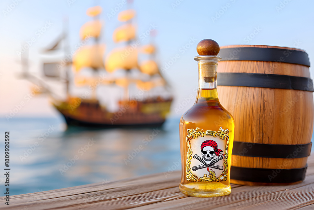 Pirate adventure theme with rum bottle and sailing ship at sea #1809920592