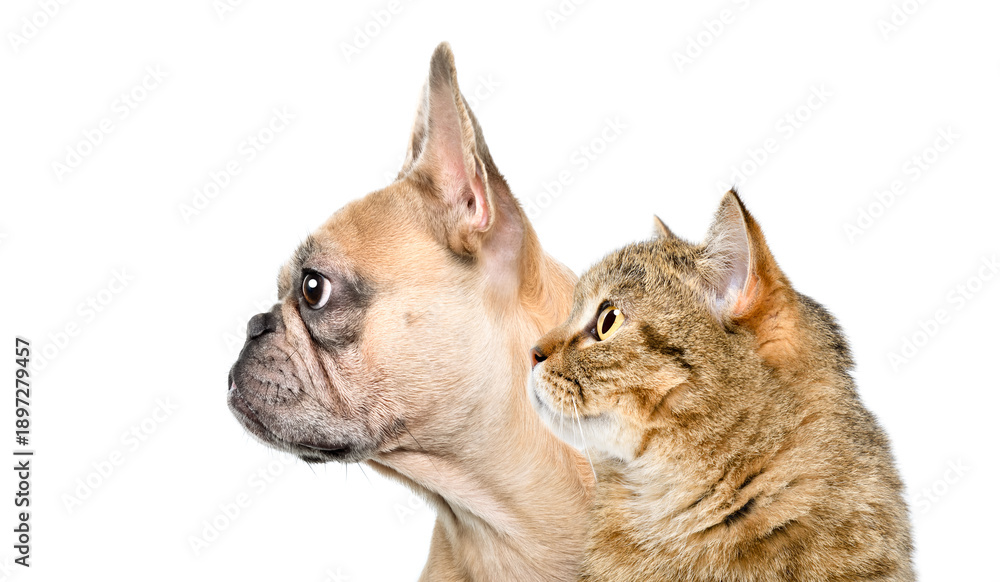 Portrait of a French bulldog and a Scottish Straight cat together, closeup, side view, isolated on white background #1897279457