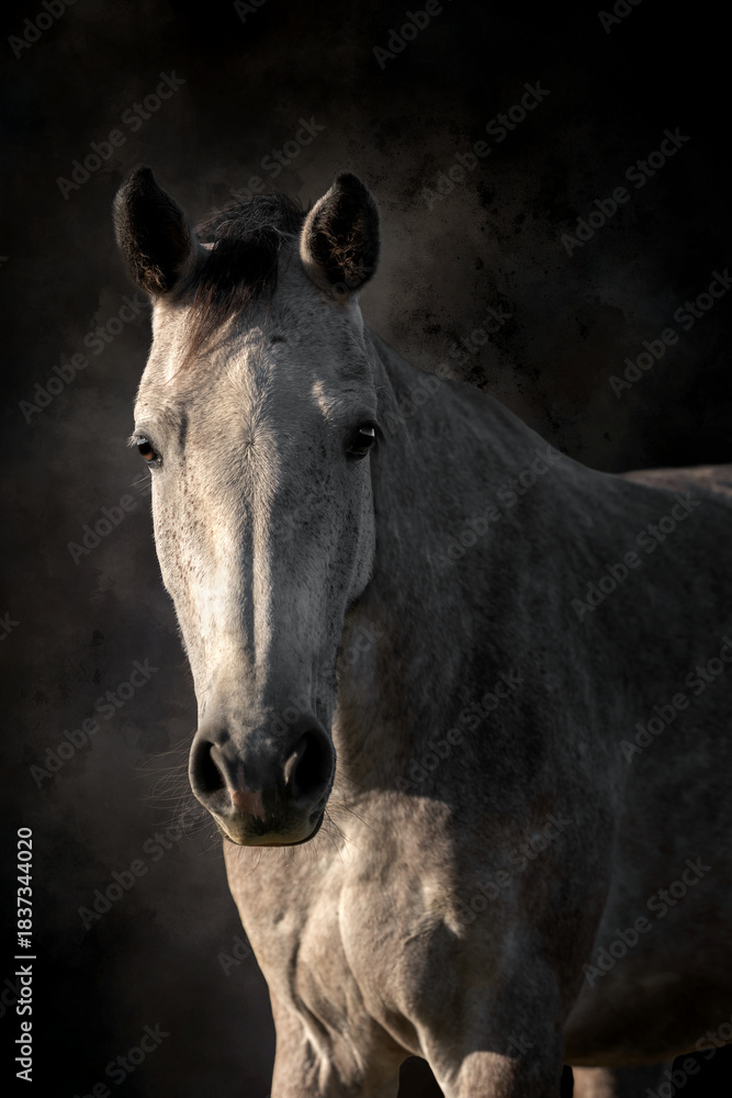 Portrait of elegant white horse on painted background. Studding portrait capture, and fine details of the horse. Fine art photography #1837344020