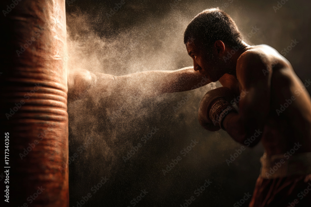 Powerful Boxer Striking Heavy Bag with Dust in Motion #1717340305