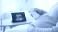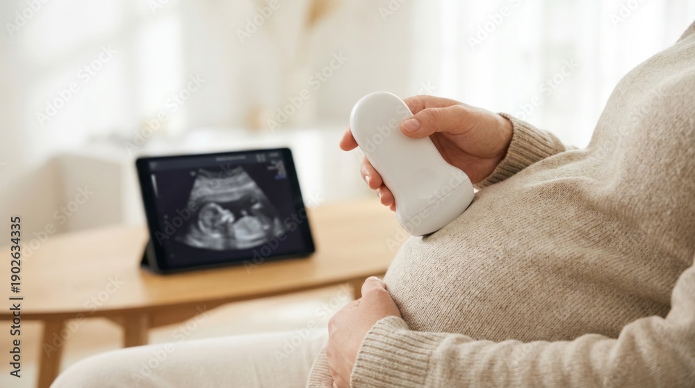 Pregnant woman using portable ultrasound scanner for at-home fetal monitoring with digital tablet display, illustrating telehealth prenatal care innovation and technology integration #1902634335
