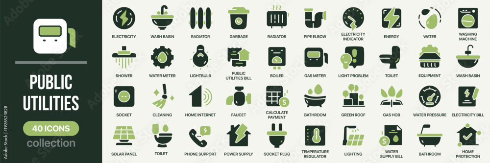 Public utilities fill icon collection. Includes electricity, water, gas meter, radiator, boiler, and socket symbols. Created in colored style with green palette #1926524828
