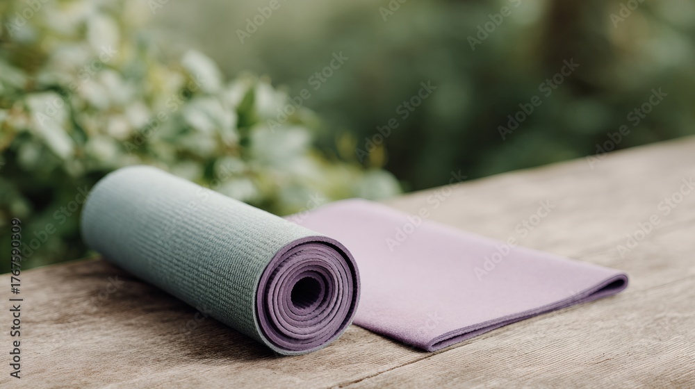 Purple yoga mat is rolled up on a wooden table #1767590309