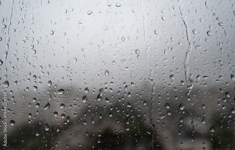 Rain drops on window glass during cloudy rainy weather with blurred city view in the background. Concept of autumn weather, sadness, melancholy, storm, climate, and urban rainy day background. #1944209334