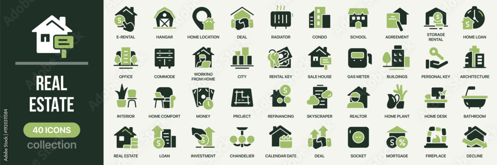 Real estate fill icon collection. Includes home, rental, realtor, investment, mortgage, building and property symbols. Created in colored style with green palette #1920311584