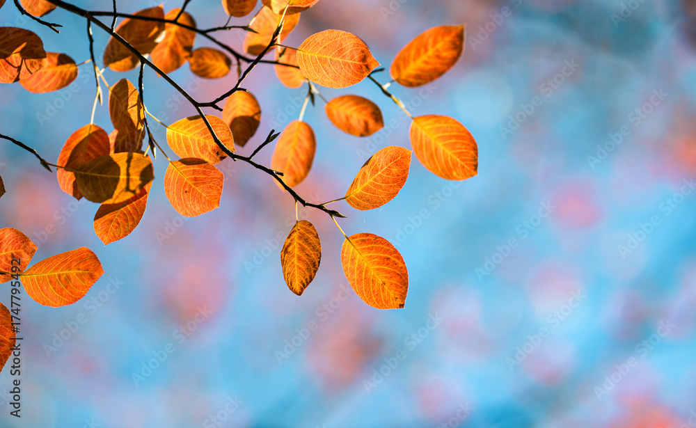 Red and orange autumn leaves on the branches against the background of the turquoise sky. Very shallow focus. Colorful foliage in the autumn forest. Excellent background on autumn theme. #1747795492