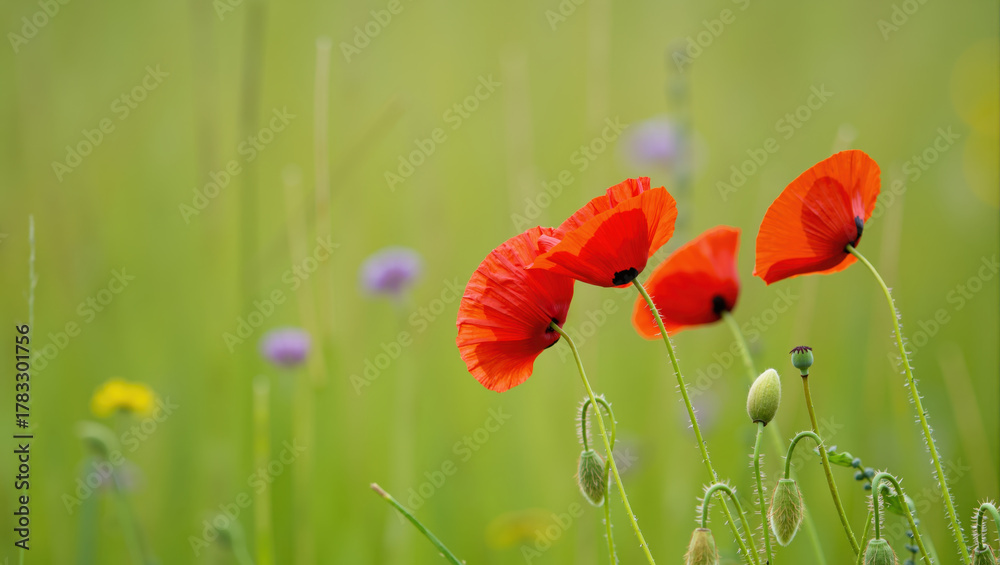 Red Poppy Flowers in a Green Wildflower Field #1783301756