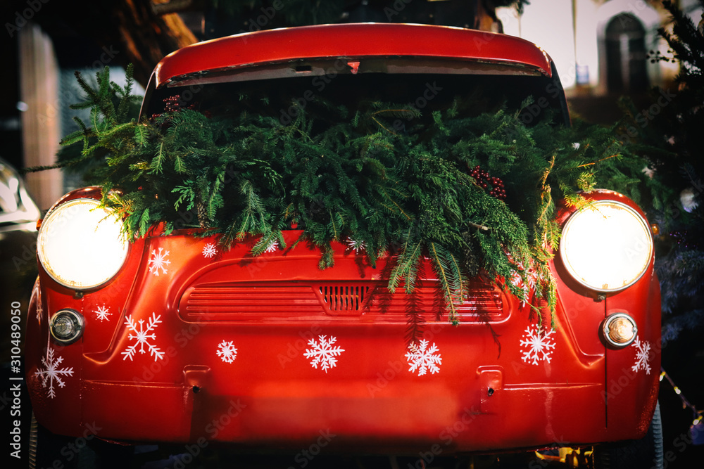 Red retro car with gift boxes and christmas tree on street night in Paris. Christmas and New Year street decoration festive lights, bokeh in the evening. Close-up #310489050