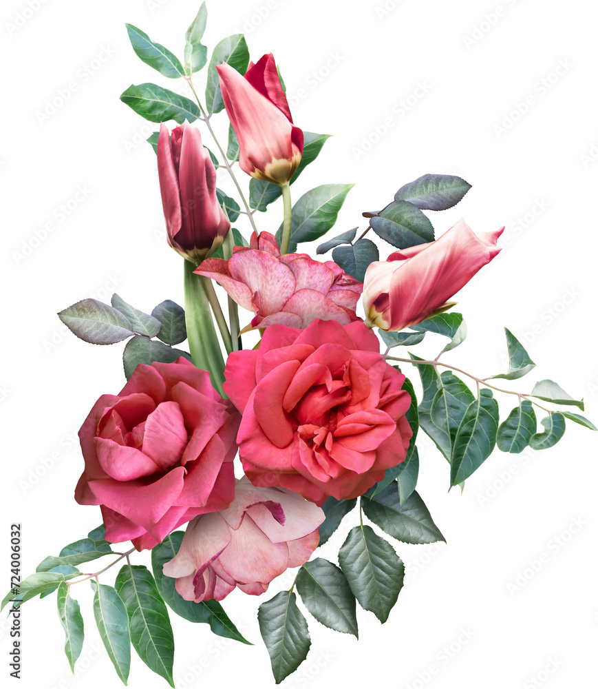 Red roses and tulips isolated on a transparent background. Png file. Floral arrangement, bouquet of garden flowers. Can be used for invitations, greeting, wedding card. #724006032