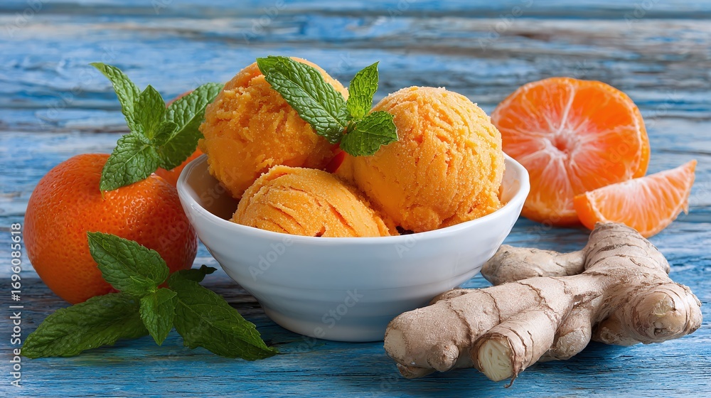 Refreshing scoops of bright orange fruit sorbet in a white bowl, garnished with fresh mint, alongside whole and sliced mandarin and ginger root. #1696085618