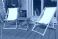 Relaxing outdoor seating with two white deck chairs and a wooden table #1959630790