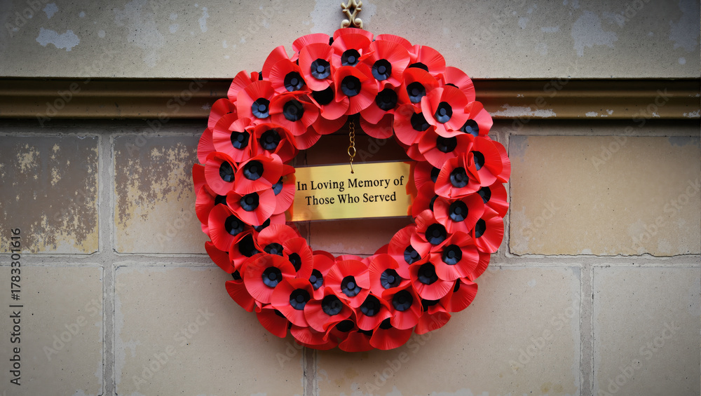Remembrance Day Poppy Wreath on Memorial 'In Loving Memory' #1783301616
