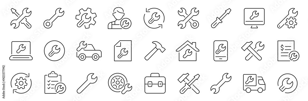 Repair and Service thin line icons set. Maintenance, Screwdriver, Wrench icon. Auto service. Editable stroke. Vector #1423377942