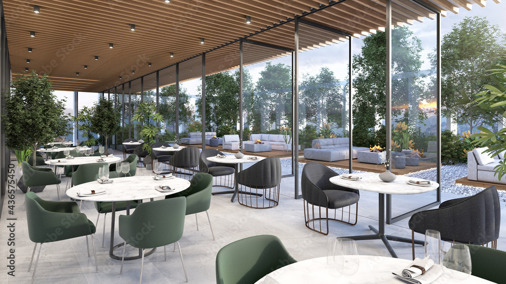Restaurante con terraza con jardines y mesas redondas, 3d render #436575450