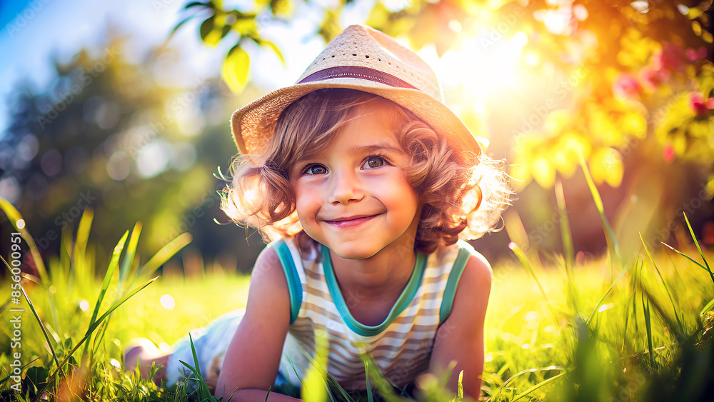 Retrato de un niño tumbado en el césped. Actividades de verano divertidas. Infante jugando y tomando el sol en el jardín. #856000951