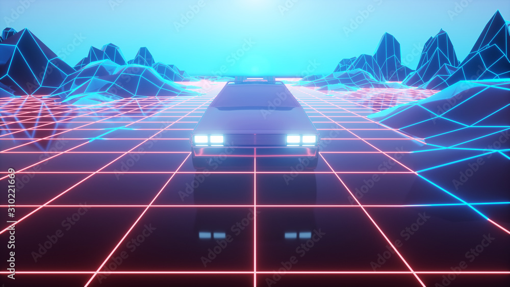 Retro futuristic car in 80s style moves on a virtual neon landscape. 3d illustration #310221669