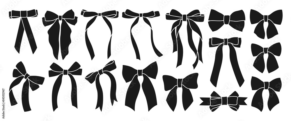 Ribbon bows stamp set. Trendy elegant simple sign bow for celebrations Valentines Day, wedding or birthday decoration. Various cartoon icon knot gift symbol tape ribbon accessory. Vector illustration #845012967