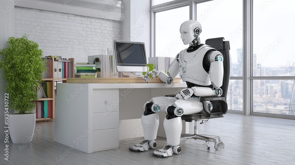 Robot sits at office desk. #1935430722